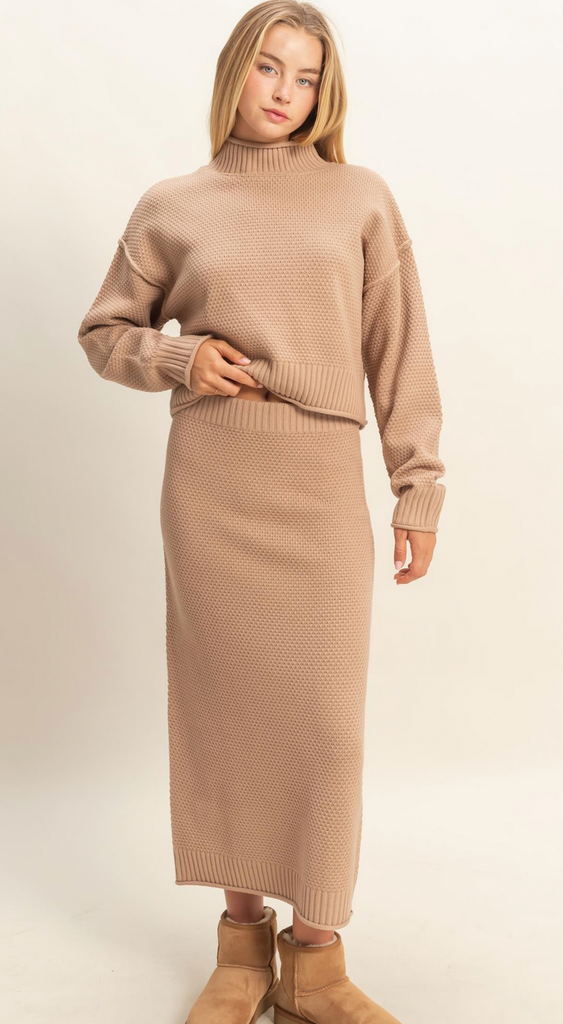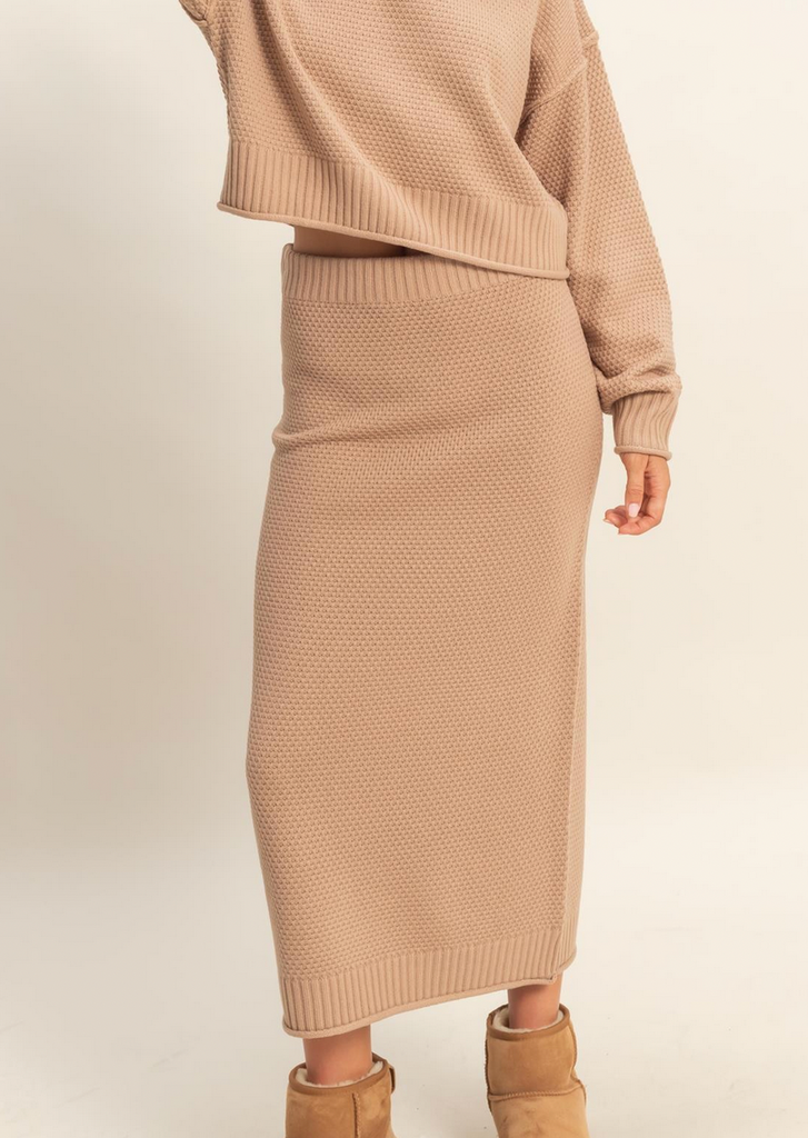 The Willa Waffle Knit Midi Skirt delivers cozy sophistication in a flattering, easy-to-wear shape. Featuring a soft textured knit, ribbed waistband, and midi length, it’s perfect for relaxed days or dressed-up nights. Pair it with the matching mock neck sweater for a polished knit set that’s equal parts comfort and style.