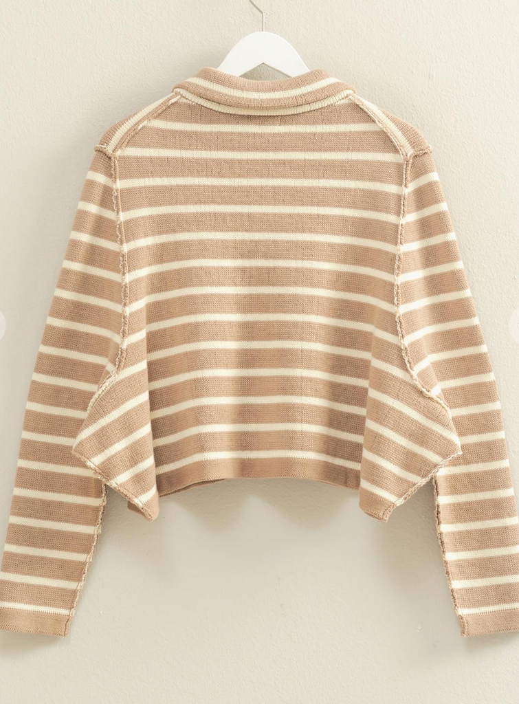 The Charlie Striped Knit Button-Up is an effortless layer with timeless charm. Designed with a collared neckline, front pockets, and a cropped, relaxed fit, this neutral-toned knit pairs perfectly with denim or trousers. Its soft feel and subtle structure make it the perfect blend of comfort and polish.