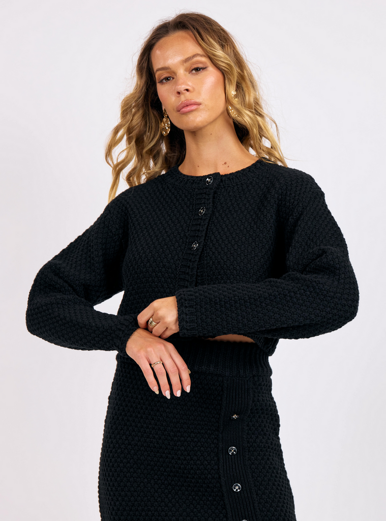 The Odessa Cardigan features a rich waffle-stitch texture and a modern cropped silhouette, finished with glossy statement buttons. Soft and cozy yet polished, it’s perfect over dresses, tanks, or the matching knit skirt. A versatile layer that brings effortless style and dimension to cool-weather outfits.