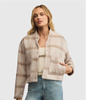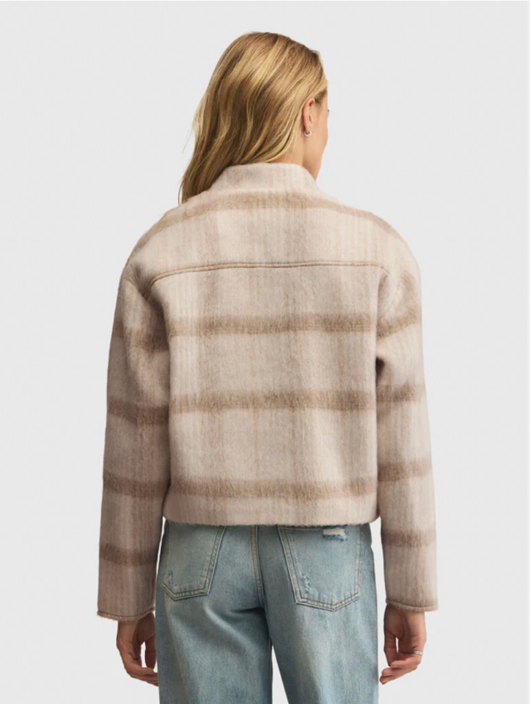 This cozy plaid jacket is a perfect layering piece for the cooler months. It features a slightly cropped fit and is made from a soft, textured material. It's finished with a snap button front, a mandarin collar, and two large front pockets for added style and convenience.