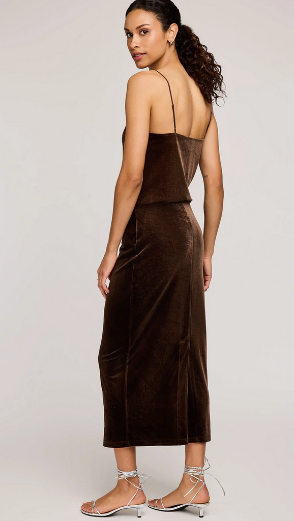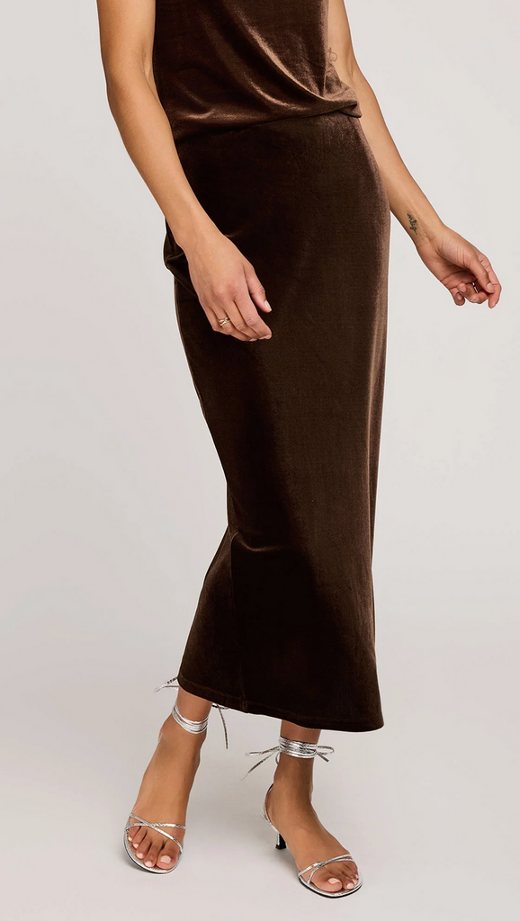 The Dahlia skirt is made of a luxe velvet fabric. Features include an internal elastic waistband with a delicate scallop trim along the edge and a back slit.