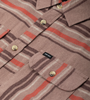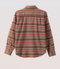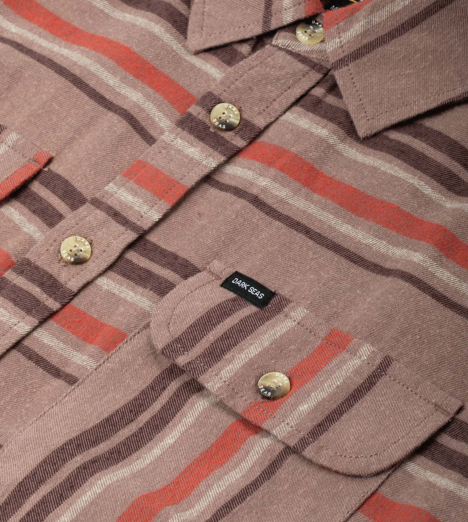 Custom yarn dye plaid lightweight flannel shirt. Chest pockets with flaps. Engraved tortoise buttons. Dark Seas woven label branding60% cotton / 40% poly