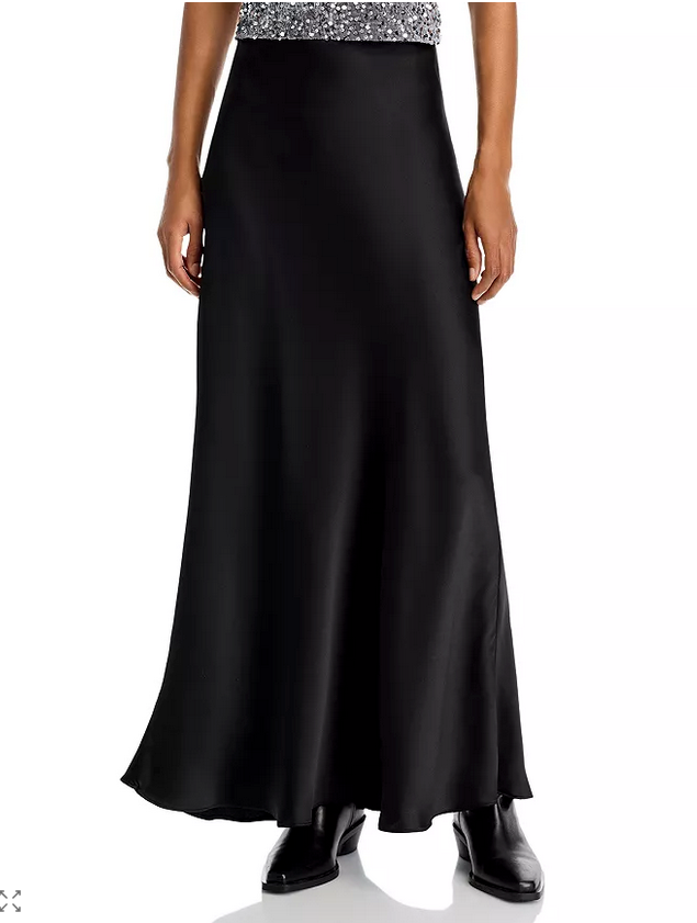 The Jeannie Satin Maxi Skirt brings timeless sophistication with its silky, bias-cut silhouette that moves beautifully with every step. Its smooth black satin finish pairs perfectly with heels or boots, making it a year-round staple for everything from dinner dates to formal events.