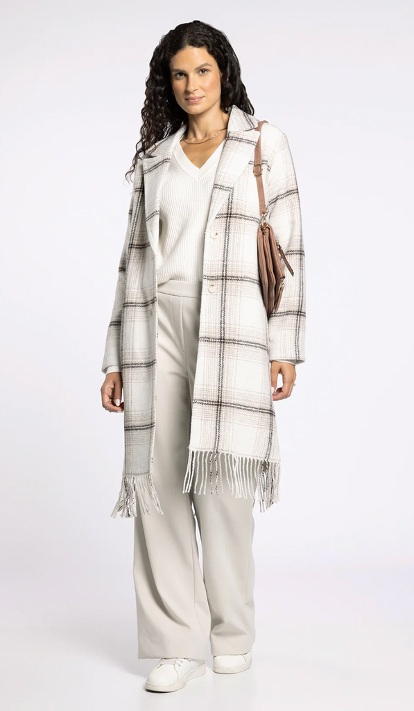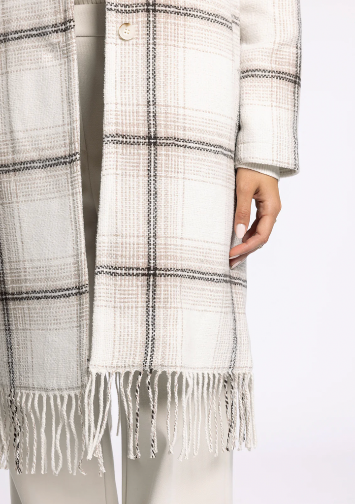 Taking the staple coat up a notch, this so cool version is featured in a longline silhouette with dual side pockets, notch lapel, and a fringe hem for added dimension.