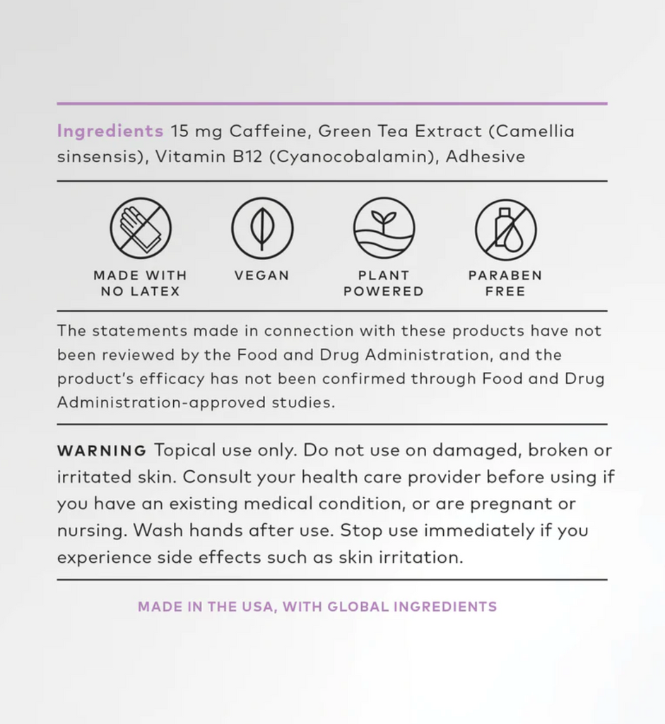 A plant-powered wearable wellness patch. Peel and place one patch on inside of wrist, or any venous area that is clean and dry. Patch may be worn up to 12 hours. All done? Simply peel the patch off and discard.